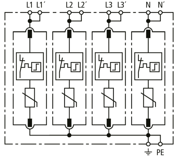 - Hohes Ableitvermögen durch leistungsfähige Zinkoxidvaristoren/Funkenstrecken