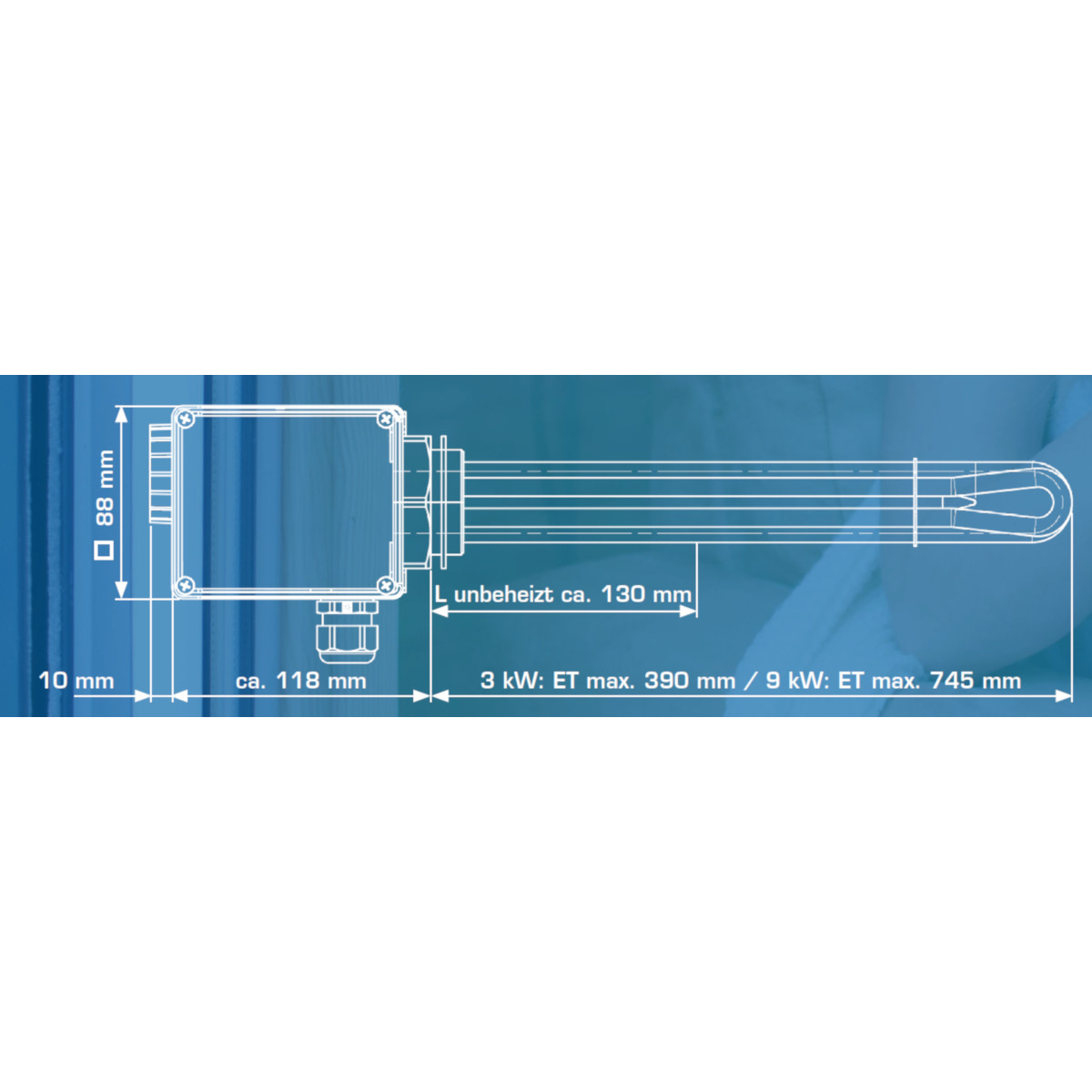 - Abmessungen (BxHxT): 88 x 88 x 518 mm mit Heizstab