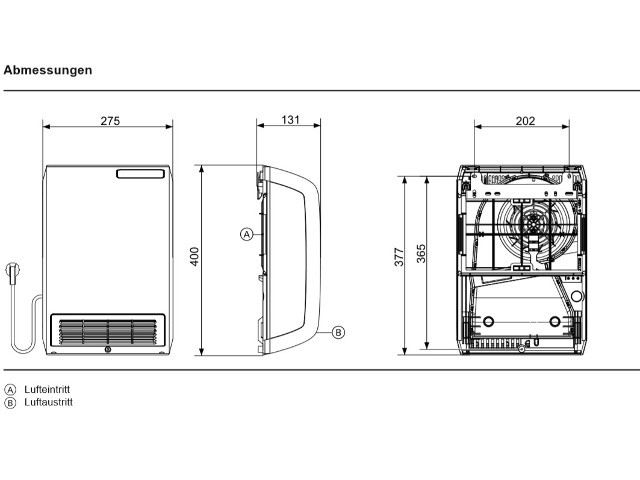 - Kompaktgerät im Kunststoffgehäuse mit hochwertigen selbstlimitierendem Keramik-Heizkörper