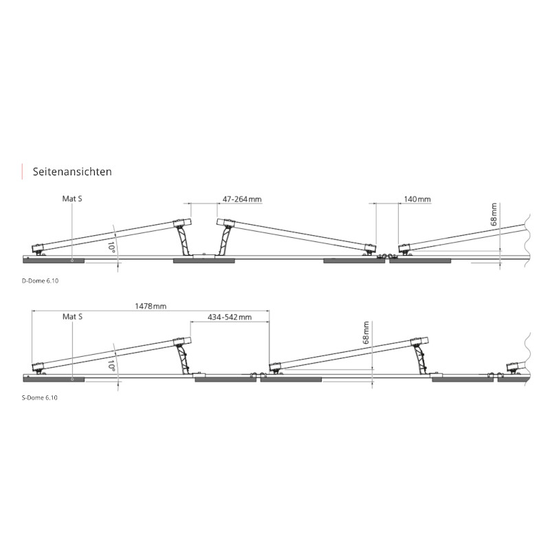 - Befestigungsart/Dachanbindung: Ballastiert; keine Dachdurchdringung bei Neigung ≤ 3 Grad, mit Festanbindung Dome FixPro Set: >3° bis ≤10°