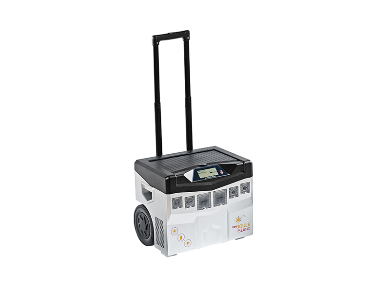 Das miniJOULE Island besteht aus einem Akku, Solar-Laderegler, Wechselrichter, Netz-Ladegerät und einem 200 Watt Solarmodul. Alle Komponenten sind praktisch in einen Trolley integriert und so mobil einsetzbar. Lediglich das mitgelieferte Solarmodul muss mit dem Island verbunden werden.