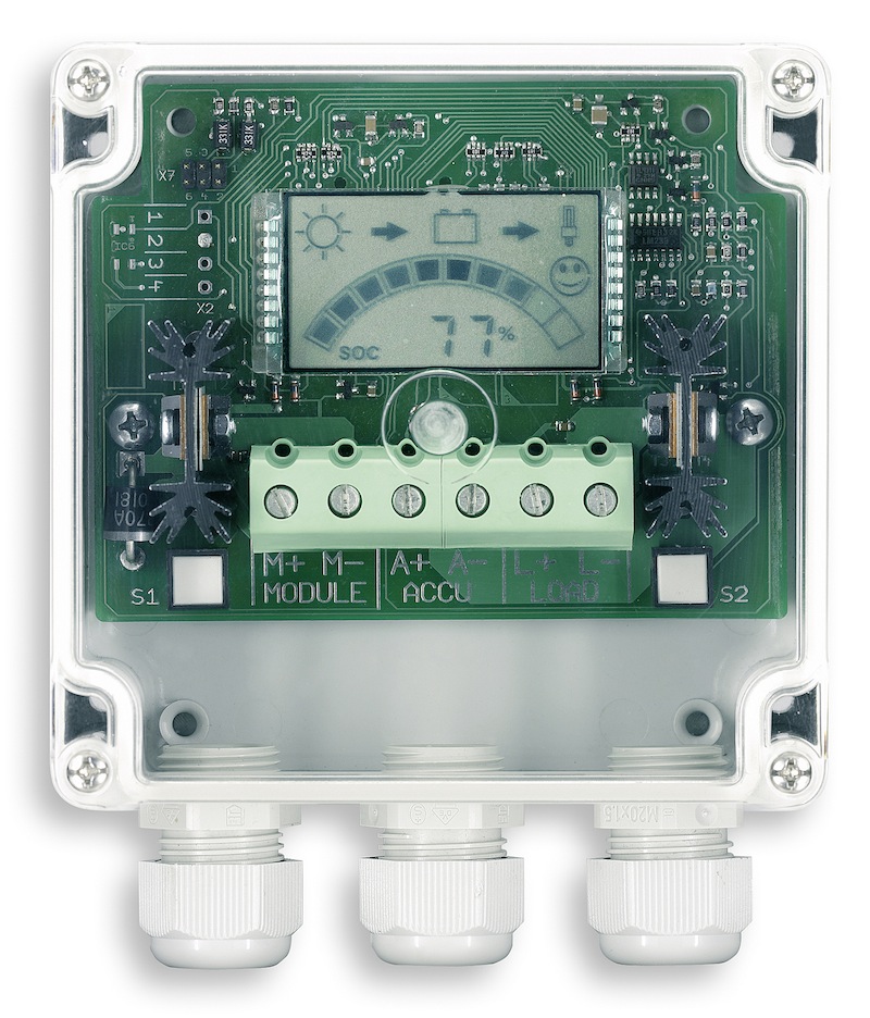 Diese ist mit einem großen Display ausgestattet, das den aktuellen Ladezustand (SOC) als Prozentzahl und in Form einer Tankanzeige grafisch darstellt. Das Kernstück des Ladereglers ist die deutlich verbesserte Ladezustandsbestimmung. Der selbstlernende Ladezustandsalgorithmus ergibt eine optimale Batteriepflege und Kontrolle der bis zu 480 Wp Modulleistung, die angeschlossen werden kann. Der Steca PR 2020 IP ist speziell für den Betrieb in schwierigen Umgebungen mit hohem Salz-, Feuchtigkeits- und Staubgehalt konzipiert.