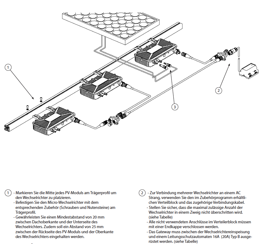Die Gateways können am RS485-Bus parallel geschaltet werden um alle Micro-Inverter mit einer zentralen Überwachungseinrichtung, z.B. AEconversion Datenlogger, zu verbinden.