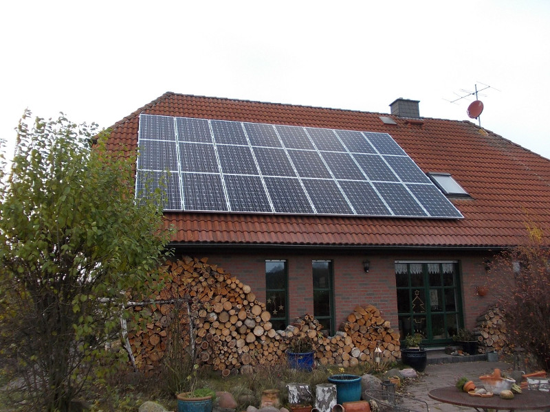 Netzgekoppelte Photovoltaikanlage im Eigenverbrauch und Überschußeinspeisung auf einem 30 Grad Pultdach (210 Grad Süd-West). Durch die schwarzen Module (schwarzer Rahmen und schwarze Rückseitenfolie) gab es eine Freigabe durch die Denkmalschutzbehörde, da die Anlage sich in Dorfmitte befindet.
