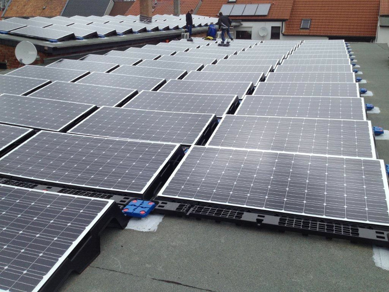 Netzgekoppelte Photovoltaikanlage im Eigenverbrauch und Überschußeinspeisung auf einem Flachdach, durchdringungsfrei montiert, Beschwerung gemäß Systemstatik für den Standort mit Gehwegsplatten auf den vorgesehenen Dome Scales.