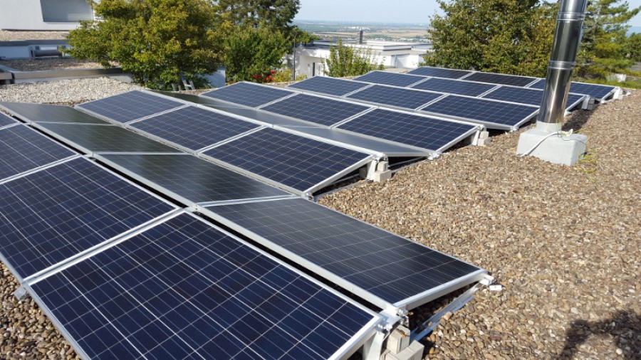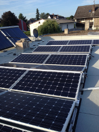 Eigenverbrauchsanlage auf einem Flachdach mit Bitumen-Schweißbahnen. Modulausrichtung durch K2 D-Dome Montagesystem in 10 Grad Ost-West Aufständerung für optimalen Eigenverbrauch. Teilverschattung durch Dachaufbauten, wie Solarthermie und Schornstein können mit dem SolarEdge System gesteigert werden, da das MPP-Tracking auf Modulebene stattfindet.
