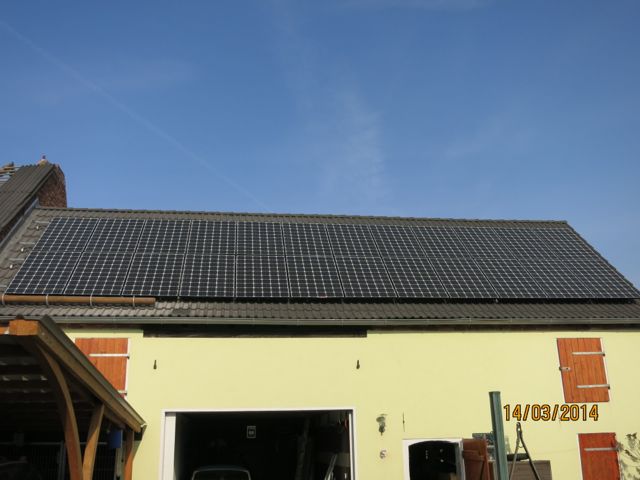 Netzgekoppelte Photovoltaikanlage im Eigenverbrauch und Überschußeinspeisung auf einem denkmalgeschützen Stall. Durch neuen Cello Module von LG Solar mit 300 Watt und hohem Wirkungsgrad konnte die Fläche optimal genutzt werden. Die komplett schwarzen Module („Cello“- bzw. „Nadelstreifenanzug“-Design) gab es eine Freigabe durch die Denkmalschutzbehörde. Von Vorteil war auch das LG Solar die Drucklast auf 6000 Pa bei dieser Modulserie erhöhte. (Wettbewerbsvorteil, Kundenvorteil hinsichtlich hoher Schneelasten). Das K2 Systems Montagesystem wurde auf dem Trapezblech mit K2 Speedrail Schienen realisiert.