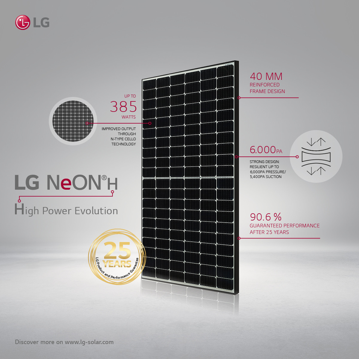 - Im Vergleich mit den Vorgängermodellen wurde bei der Entwicklung von LG NeON® H der Wirkungsgrad erheblich gesteigert. Deshalb eignet es sich besonders bei der Ausnutzung von begrenzten Platz.