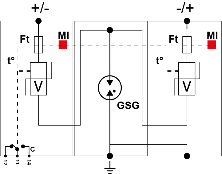 Die Schutzschaltung mit VG-Technology besteht aus einer Y-Schaltung mit Gasgefüllten Funkenstrecken und Hochleistungsvaristoren. Die spezielle Entwicklung und Zusammenschaltung der Komponenten ermöglichen eine fehlerfreie Isolationsmessung. Da keine Betriebs- und Leckströme entstehen, wird die passive Alterung verhindert.