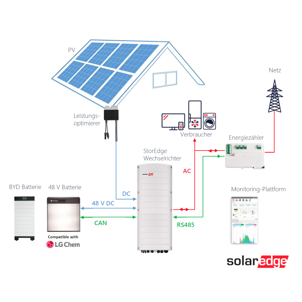 Wichtig: Der StorEdge Wechselrichter benötigt für den Betrieb SolarEdge Leistungsoptimierer (nicht im Lieferumfang enthalten)
